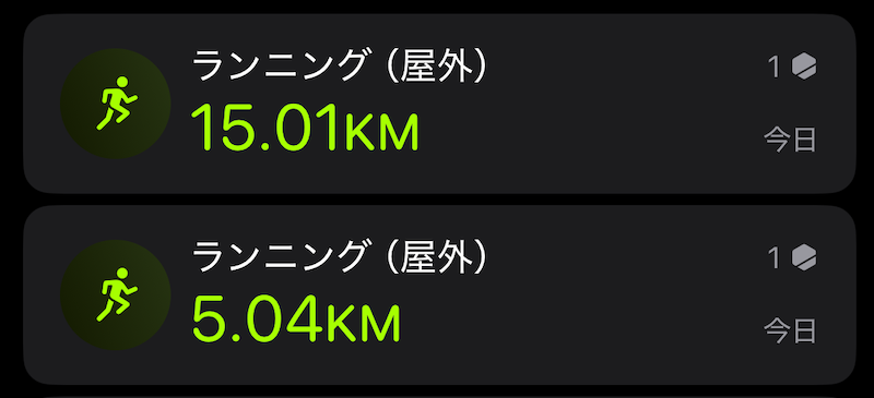 ●今日のトレーニング/(昼)ラン5km、6:08/km、(夜)ラン15km、6:06/km。