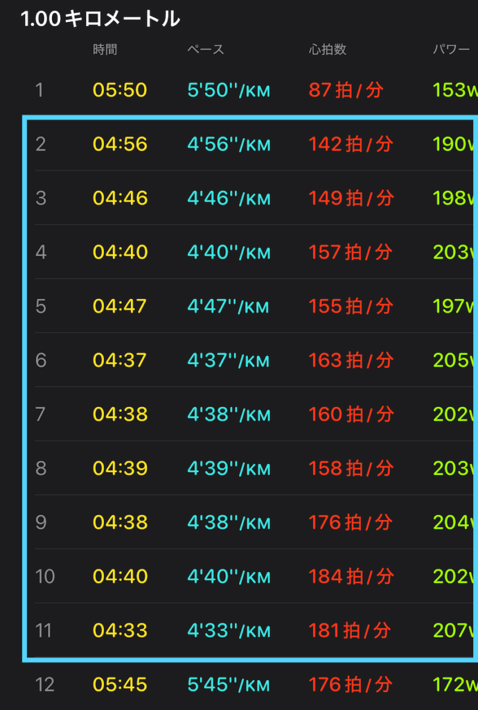 目標は4:30/kmペース。残念ながら、目標を達成した区間はなし。最後、スパートをして、ようやく4:33/km。目標達成のためには、10kmのスパート(以上)が必要です。
