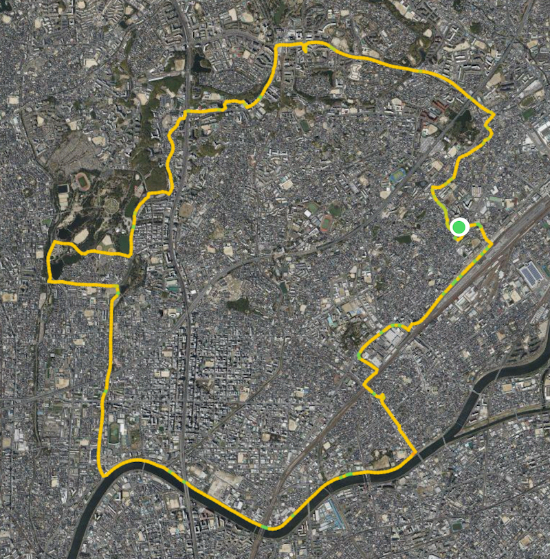 左上の緑エリアが服部緑地公園、下の川は神崎川です。こうやって見ると21kmってかなりの広範囲です。