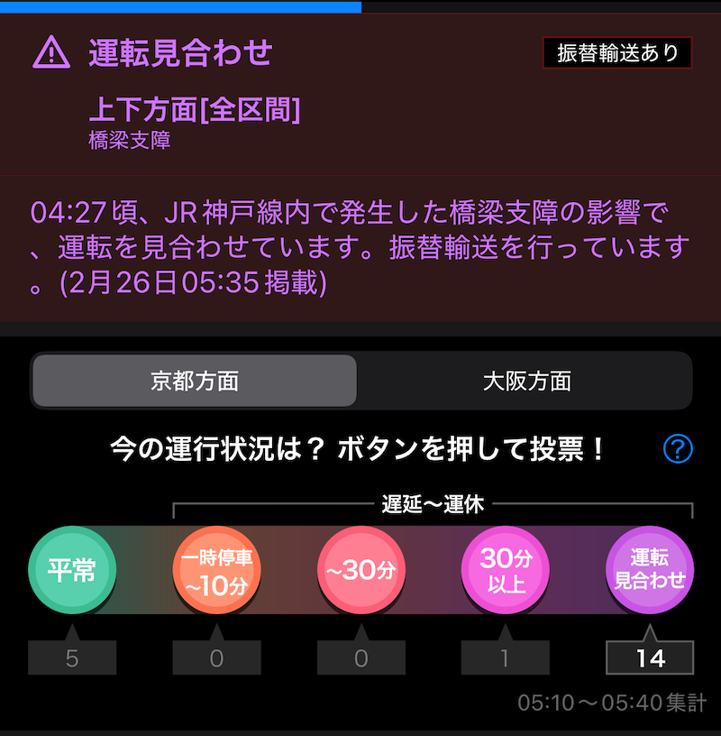 朝起きて、スマホを見ると、JR京都線が運転見合わせとなっていました。なので、出社を諦め、リモートワークに切り替えました。