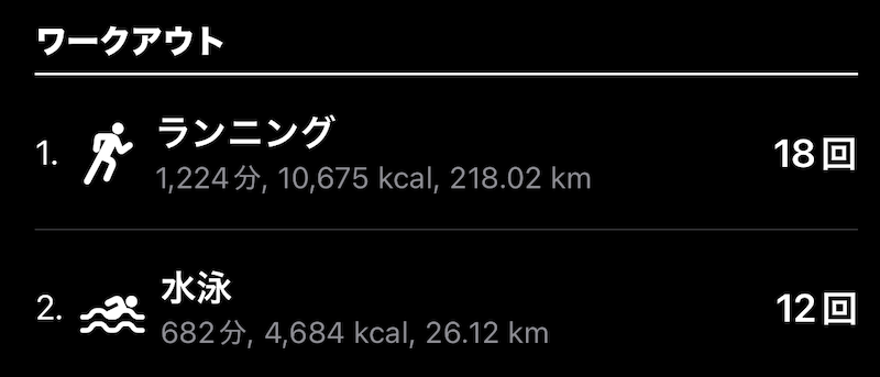 日数が2〜3日少なかったにも関わらず、ランニング(200km)とスイム(20km)の目標をクリアしました。トレーニングを休んだのは、わずか3日。よく頑張りました。