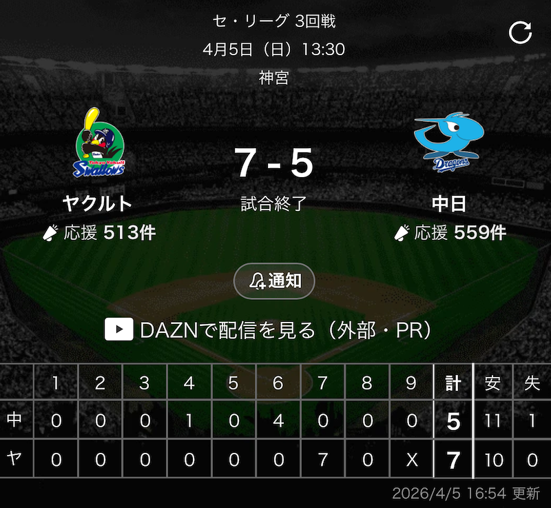 諦めなければ夢は叶う。と言いますが、私は6回裏が終わった時点で飽きらめてYouTubeに移行していました。その途中、胸騒ぎがしたのでスマホで試合経過をチェック。その時点で3−5と追い上げていました。(7回裏)