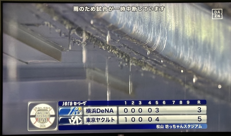 5回裏に逆転した直後に、降雨中止。スワローズファンもラッキー、何より、5回表に3点も取られて逆転されたのに勝利投手になった田口選手もラッキー。逆転された時、悲壮な顔をしてたのに。